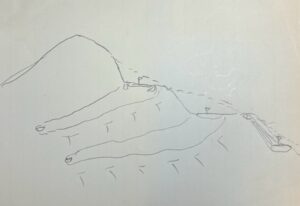 その一例として日本の山岳、丘陵地のコースで、役所からの開発許認可が降りないとゼネコン指導で土を大きく動かし、段々畑のようなテラスザホールの造成が多く造られた例があります。これらのコースは自然の等高線、つまりスロープラインを活かさず、斜面を切り土、盛り度でフラットに整地され、プレーヤービリティを謳い文句に設計されています。そしてレイアウトの大事なアクセントとなるパー3の設計が安易に扱われ、段々畑を繋ぐ高低差の縦の地形ラインに極端な打ち下ろしー3に設定されるケースもよく見かけます。下図がその段々畑のようなテラスザホールです。