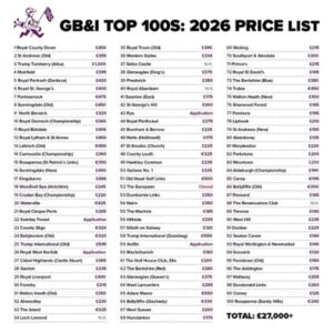 トランプの所有ではありませんが、新設されたパブリックリゾートでは、2027年アイルランドでは初のライダーカップが開催されるAdare Manor£550ポンドの高額グリーンフィを提示しており、宿泊は18世紀のマーナーハウスを改装したもので、米国からのセレブ達で賑わっているようです。ちなみに下記のTOP100ランキング表のコースをすべてプレーするならば、グリーンフィだけで£27,000ポンド以上の予算が必要になります。現在の為替レートで換算すると530万円以上となります。