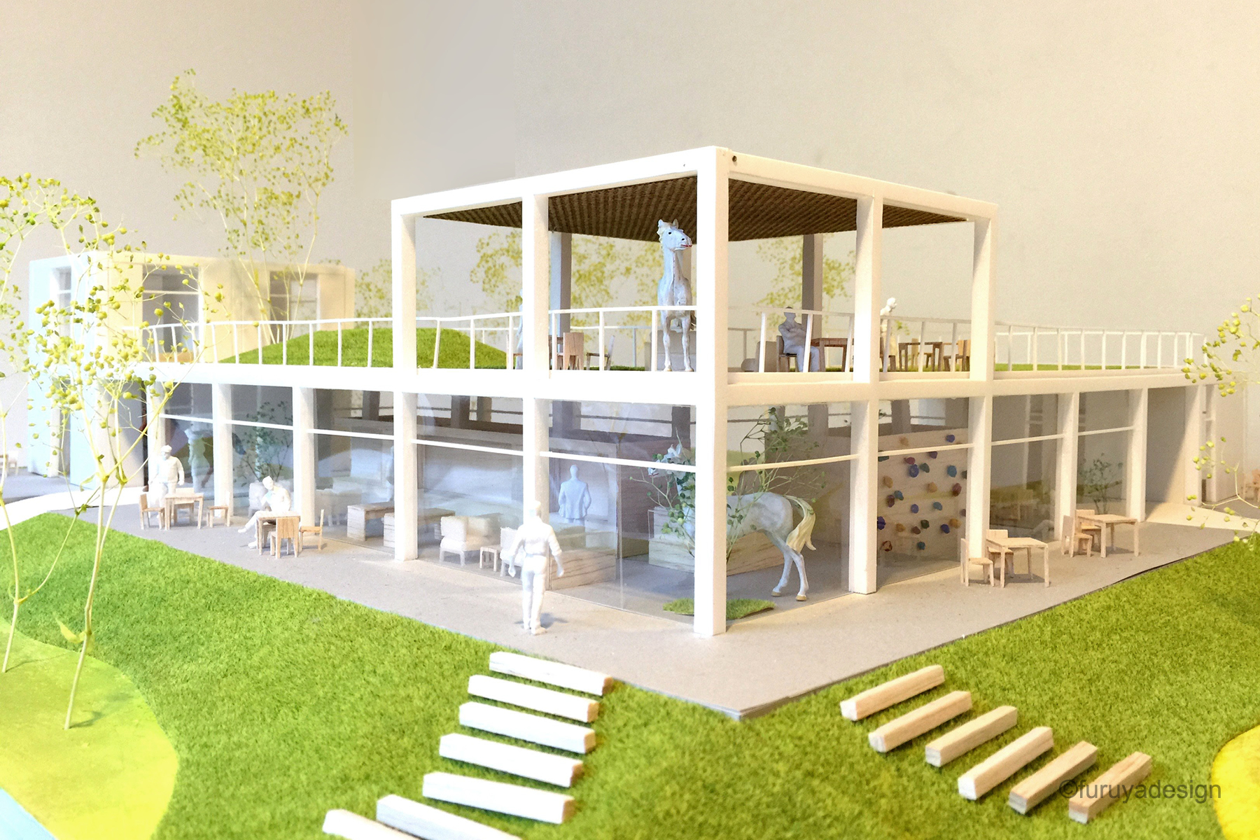 乗馬や畑仕事に必要なアイテム、畑で採れた野菜を調理するキッチン、ワークショップスペース、子供も大人もくつろげるラウンジ、樹冠に浮かぶ空中テラス。