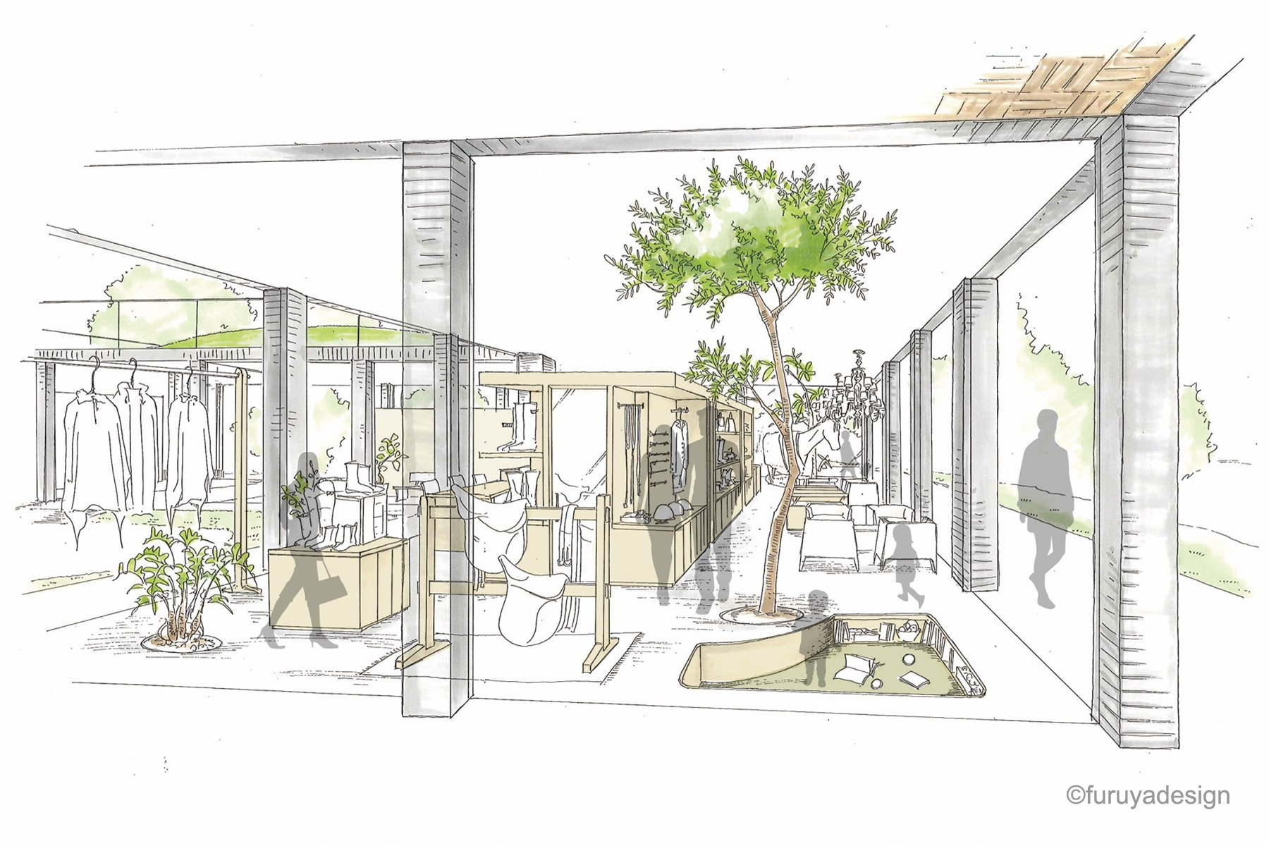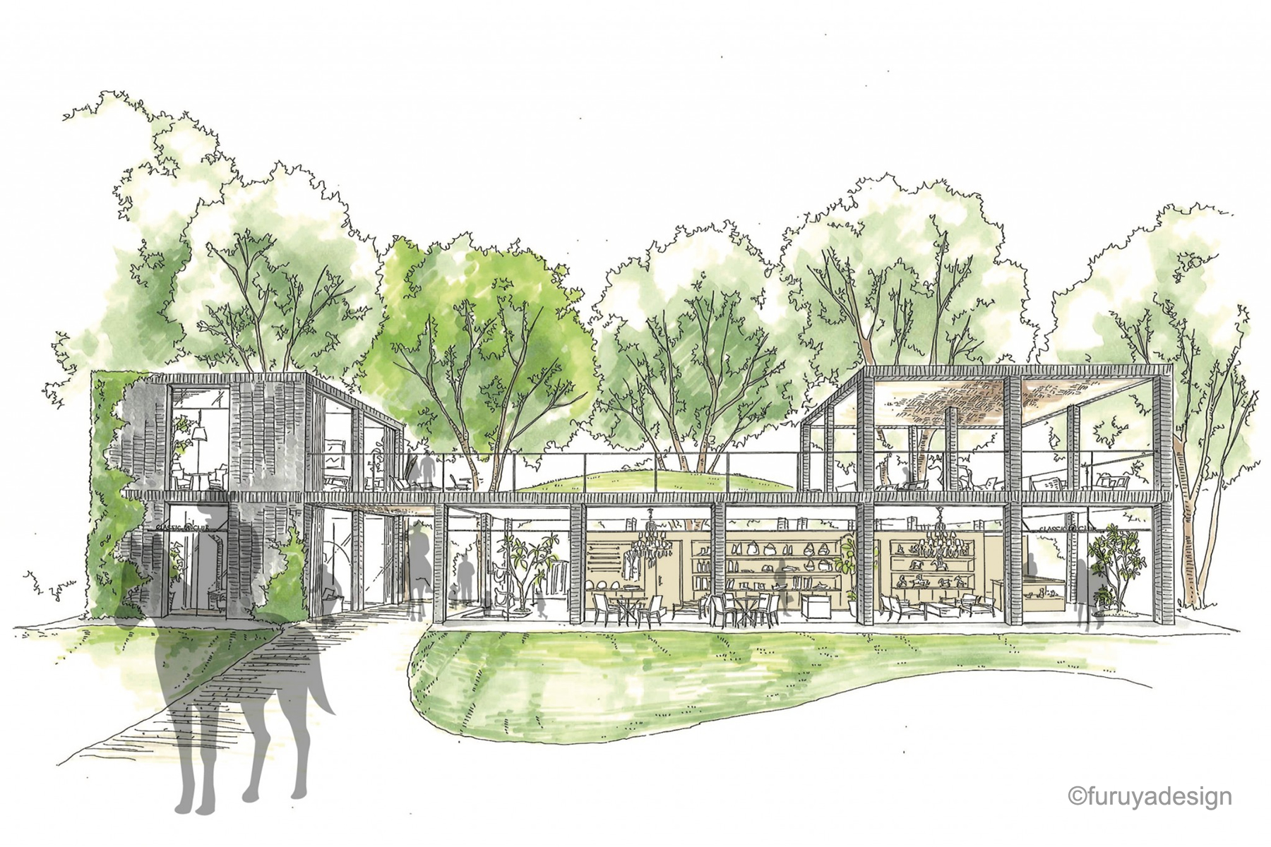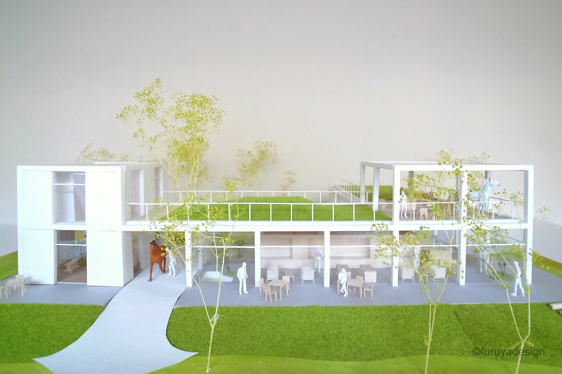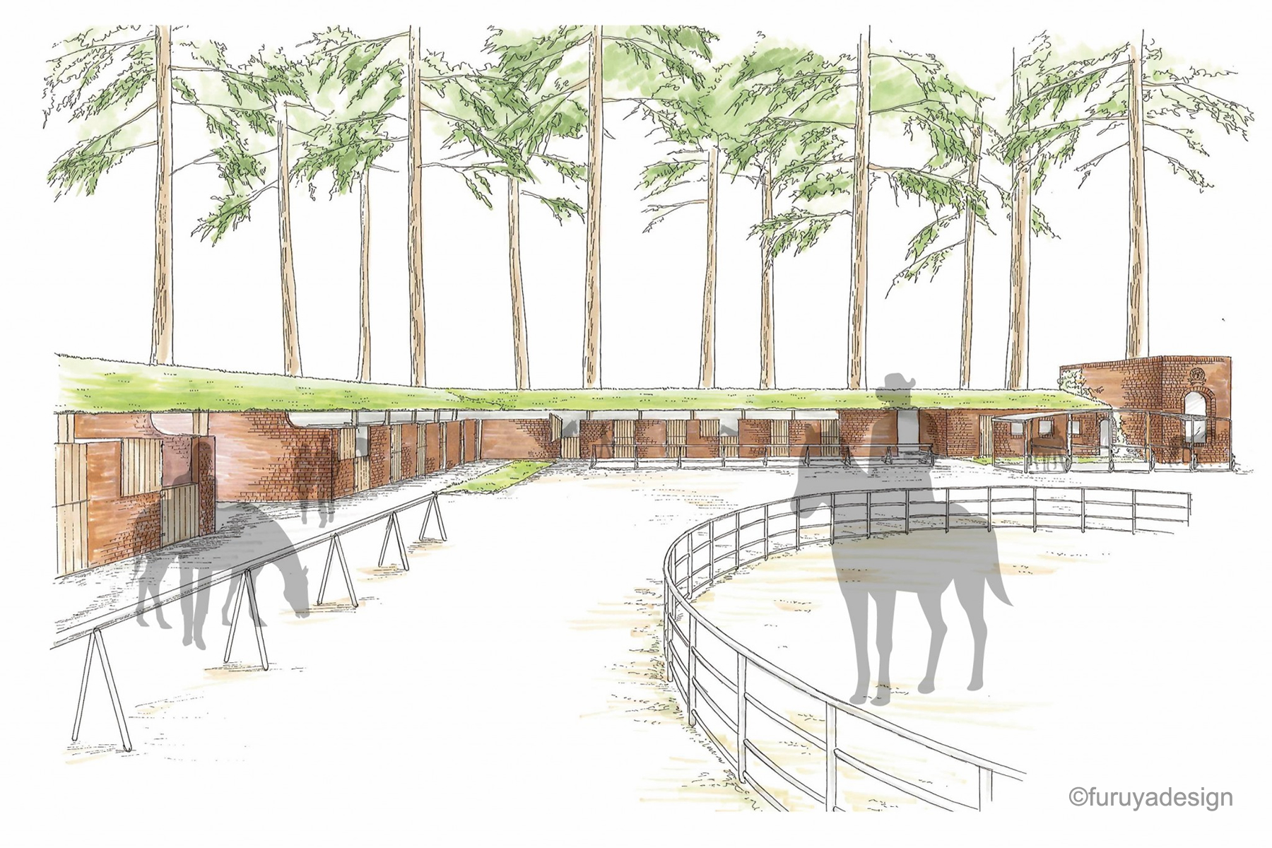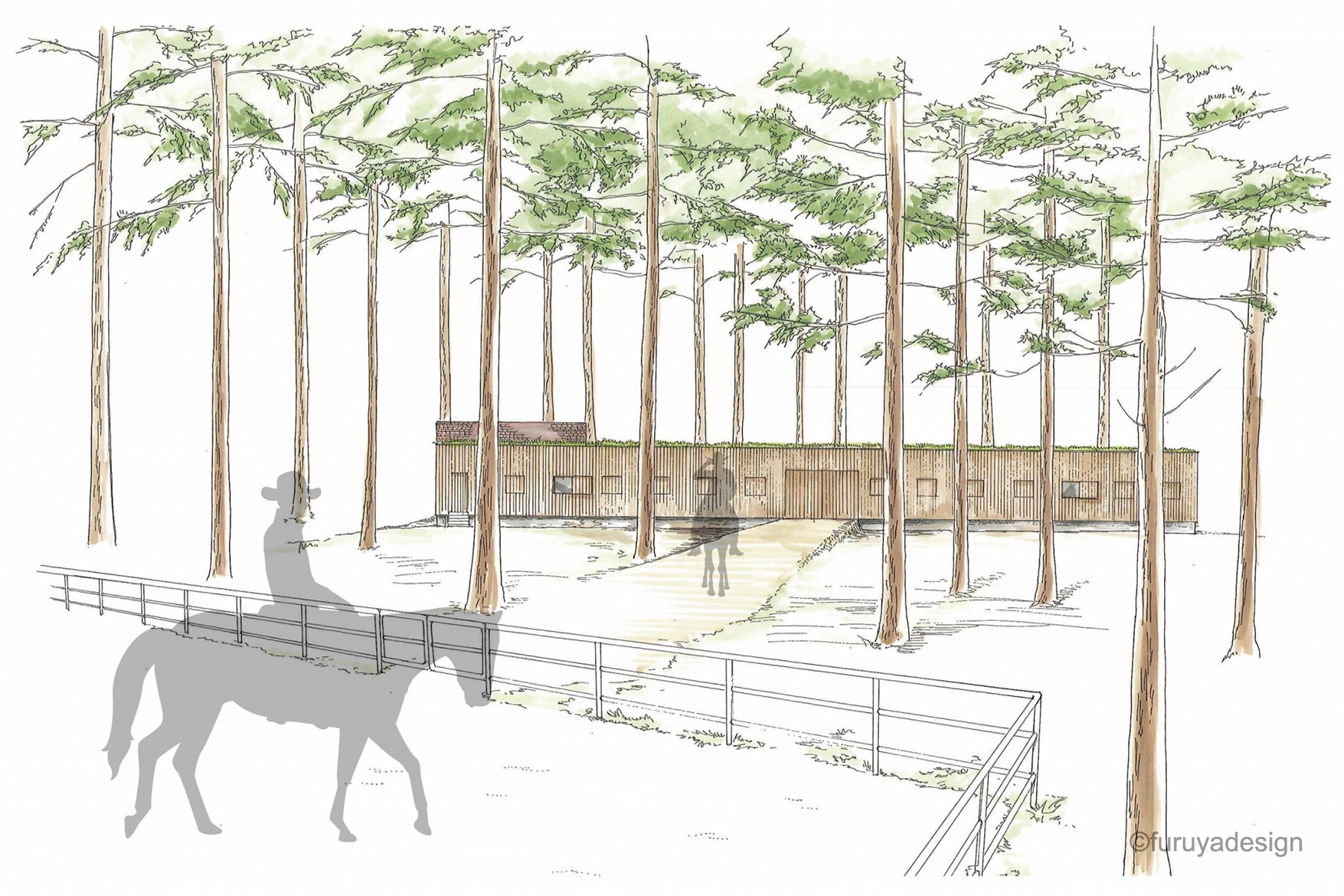 杉の木立に浮かぶ開放的な厩舎は来訪者の目にとまり、屋根に植えられた草花は風にそよぎ気持ちの良いカントリーライフをイメージさせる。